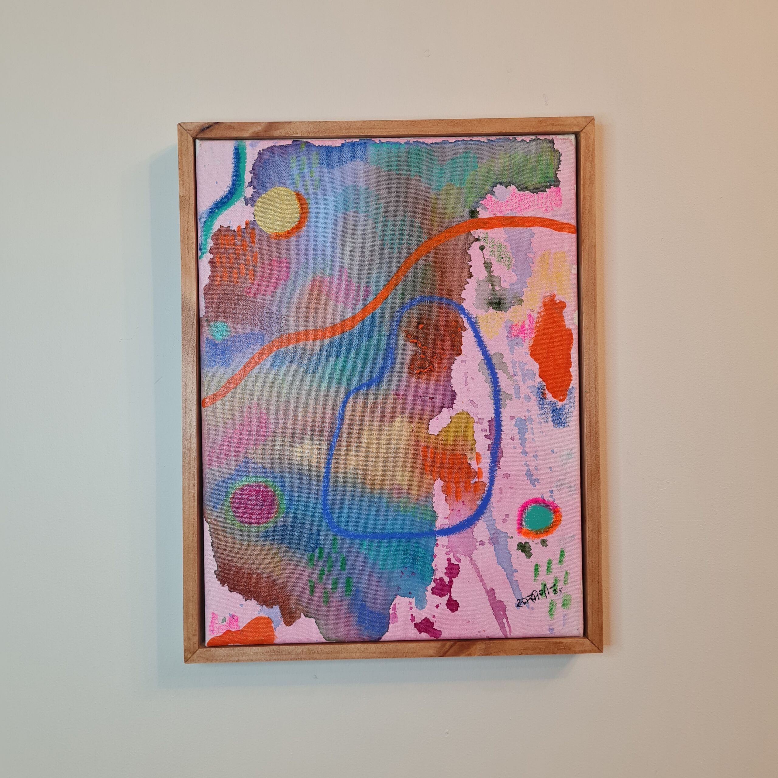 Created alongside Blush, Iridisense continues my exploration of fluid acrylics and surrendering to movement and chance. In this piece, colour pools and drifts like an oil spill touched by rain, revealing unexpected layers and a soft shimmer of rainbow hues. The surface feels alive — shifting, dissolving, reforming — echoing the fragile magic that appears when control is released. Iridescence celebrates the quiet moments when chaos becomes beauty, and colour finds its own way to shine.