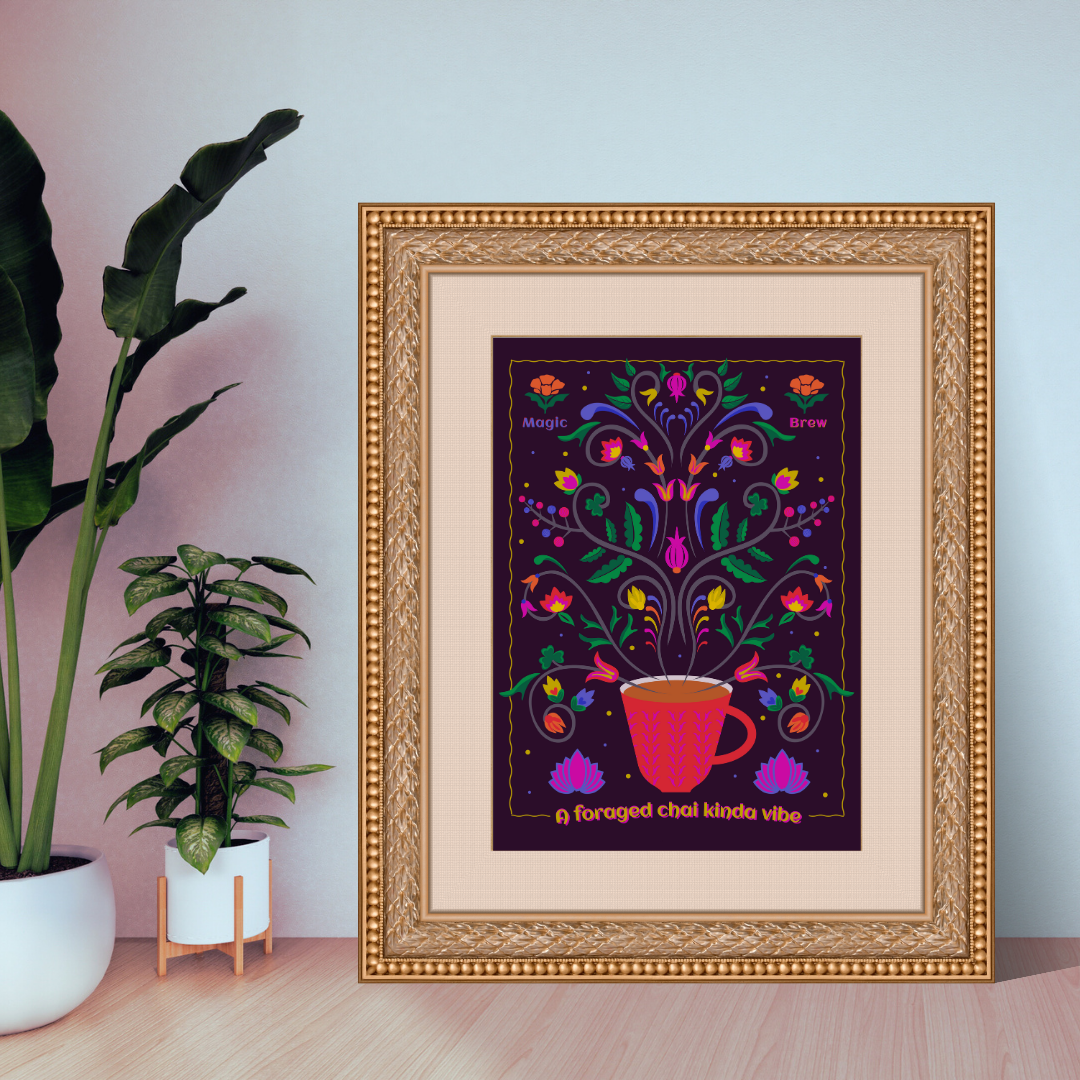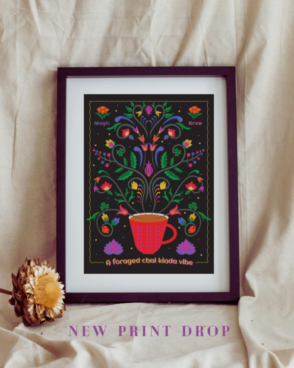 Created to coincide with Samhain and Diwali, this artwork celebrates two festivals that both honour light, transformation, and the turning of seasons. It brings together the folklore and mysticism of Ireland with the rituals and traditions of my Indian heritage. In many ways, it is about unity and diversity, about finding belonging between cultures, and about celebrating life’s small, magical moments—like gathering around a pot of chai.