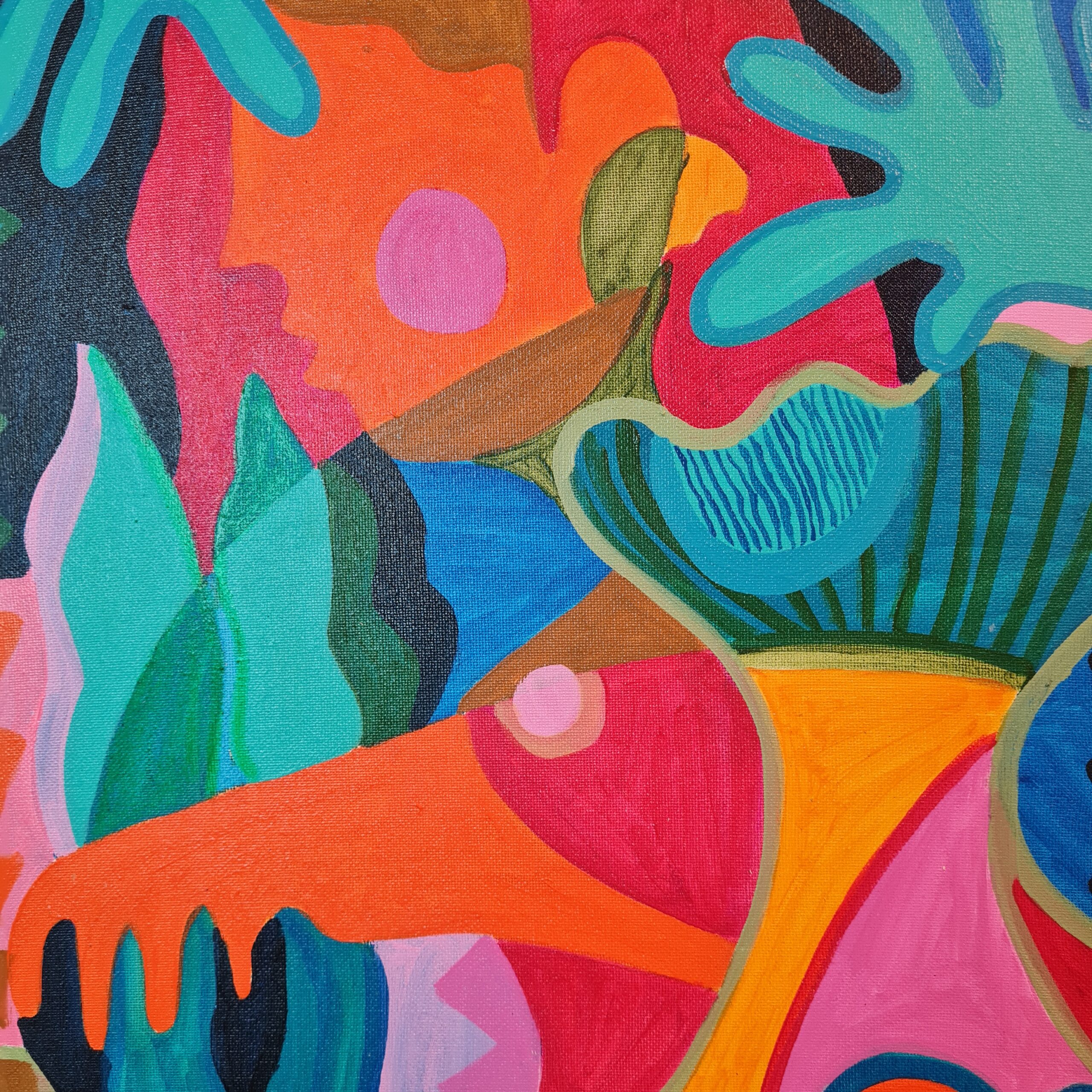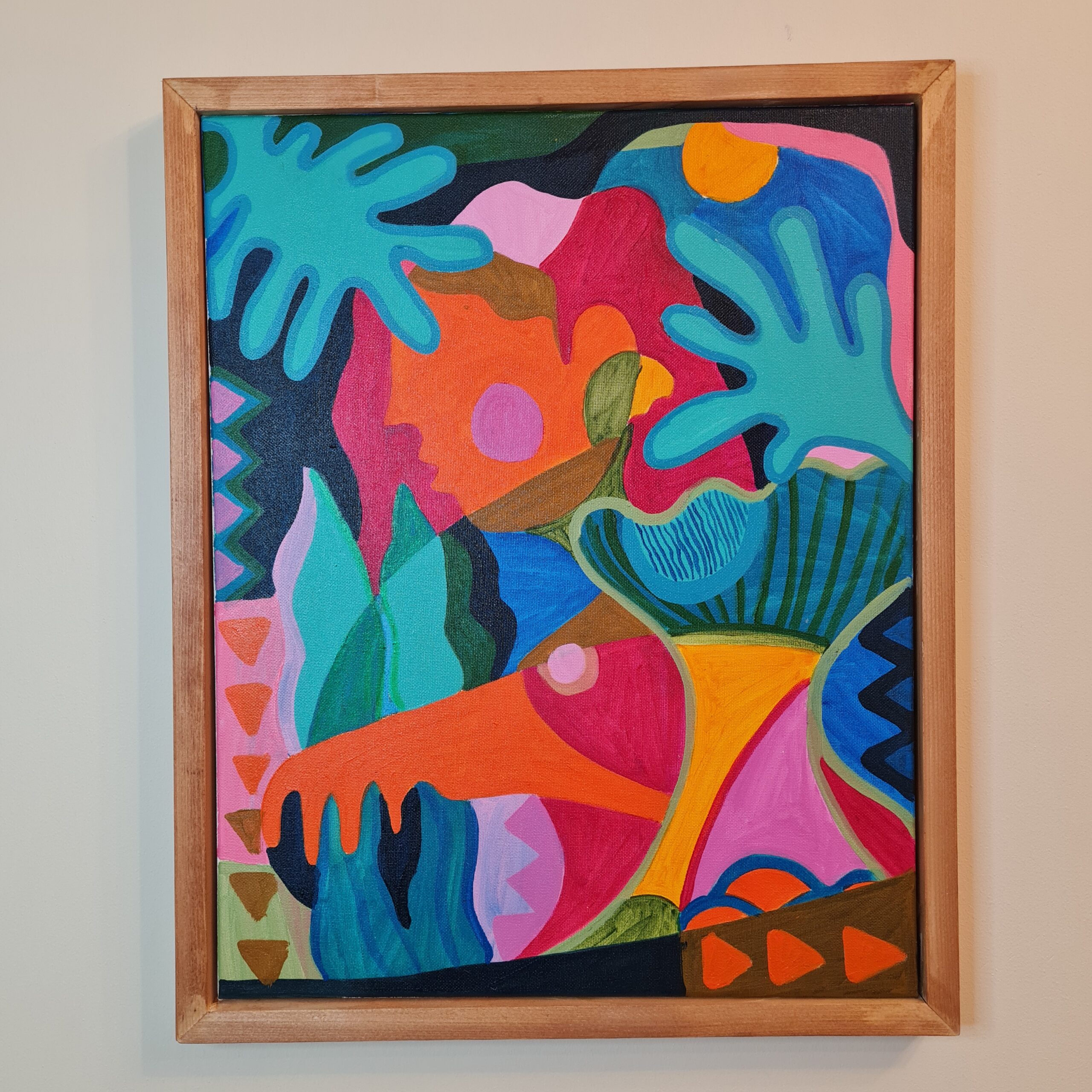 One of the larger works in the Dear Pandora exhibition, She Swam Past Her Fears is a celebration of courage — of the small, quiet incentives we give ourselves each time we act bravely. A mermaid emerges from vivid, flowing colour, inspired by my love of folklore and the enchantment of the Irish sea.